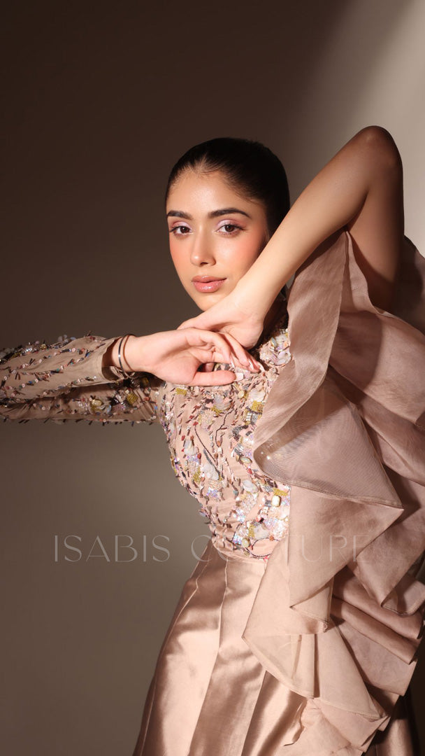 This Ruffled Fish Gown is perfect for creating a sophisticated and fashionable look. Its perfect shade of brown gives it a timeless and classic style, perfect for ceremonial events, photoshoots, or shows. Let this gown define your style and influence your style.